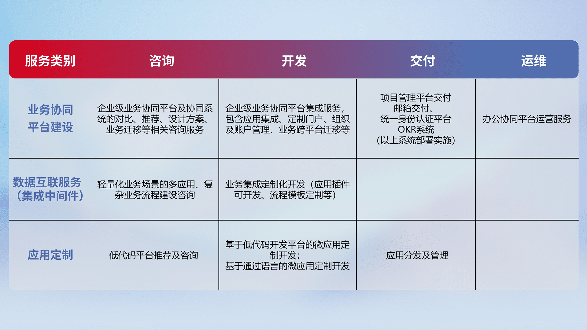 针对钉钉、、、、企微、、、IDaas等平台级产品提供产品的规划、、方案、、交付、、、定制化开发等服务,,实现如统一协同办公、、、智能客户服务、、混合会议管理、、智能数据查询、、、等业务场景,,,,实现数字化转型。。